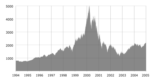 The NASDAQ index from 1994-2004, showing the dot-com bubble.